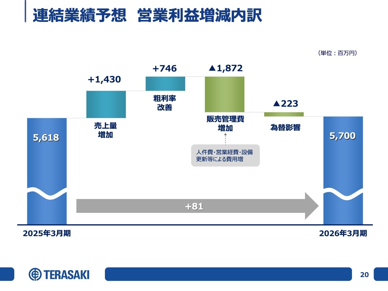 連結業績予想と営業利益の増減内訳についてです。売上の増加により14億3,000万円のプラス、粗利率の改善により7億4,600万円のプラスとなる見込みです。一方、販管費の増加により18億7,200万円のマイナス、為替の影響により2億2,300万円のマイナスを見込んでおり、最終的な営業利益を57億円と予想しています。