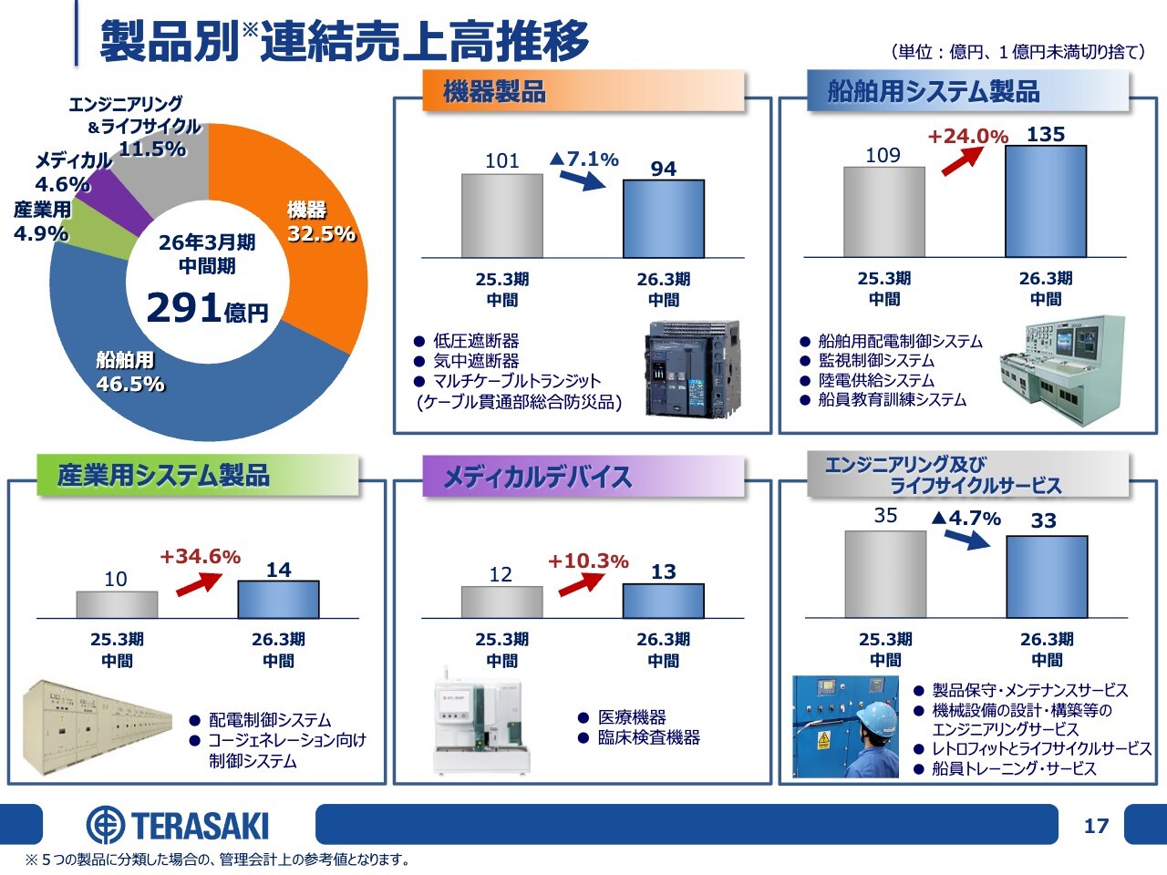 船舶用システム製品の売上高は135億円、前年同期比で24パーセント増加しました。産業用システム製品の売上高は14億円、前年同期比で約34パーセント増加しています。メディカルデバイスは前年同期比で約10パーセント増加、エンジニアリング及びライフサイクルサービスは前年同期比で若干の減少となりました。