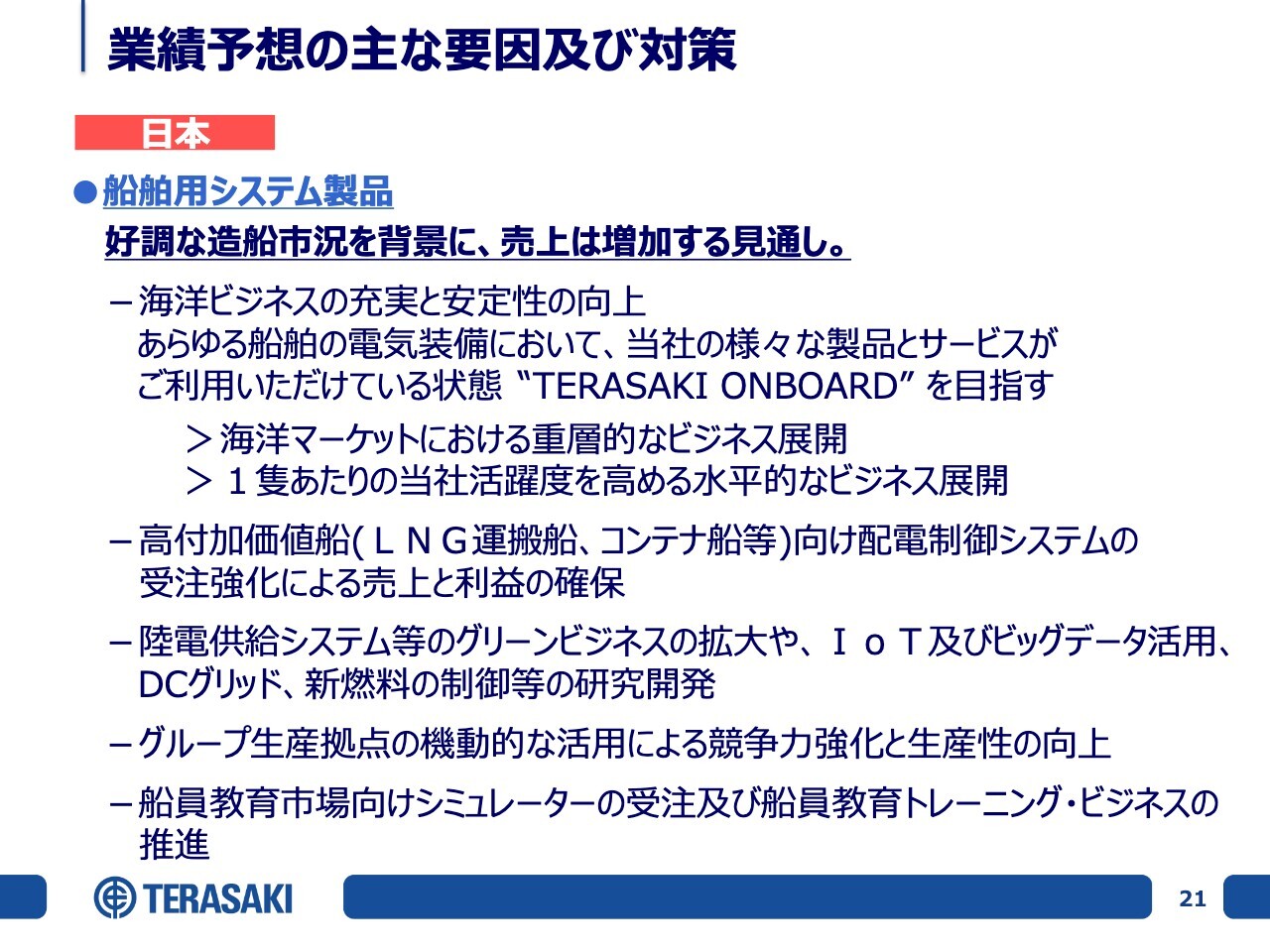 2026年3月期については、引き続き高付加価値船であるLNG運搬船やコンテナ船向けの受注強化に取り組むとともに、売上及び利益の確保に努めます。また、環境関連として、陸電供給システム等のグリーンビジネスの拡大、IoT及びビッグデータの活用、新燃料の制御技術や、船舶のハイブリッド化・EV化のためのDCグリッドの製品開発にも注力しています。
