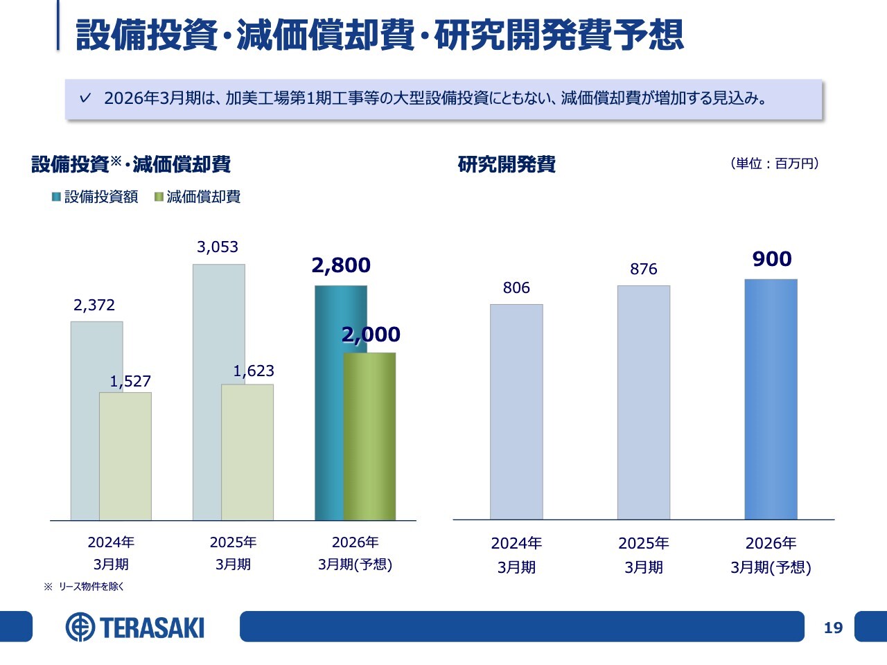 設備投資、減価償却費、研究開発費の予想についてです。今期は加美工場第1期工事への大型投資があったため、減価償却費は増加する見通しです。2026年3月期の予想としては、設備投資が28億円、減価償却費が20億円、研究開発費が9億円と見込んでいます。