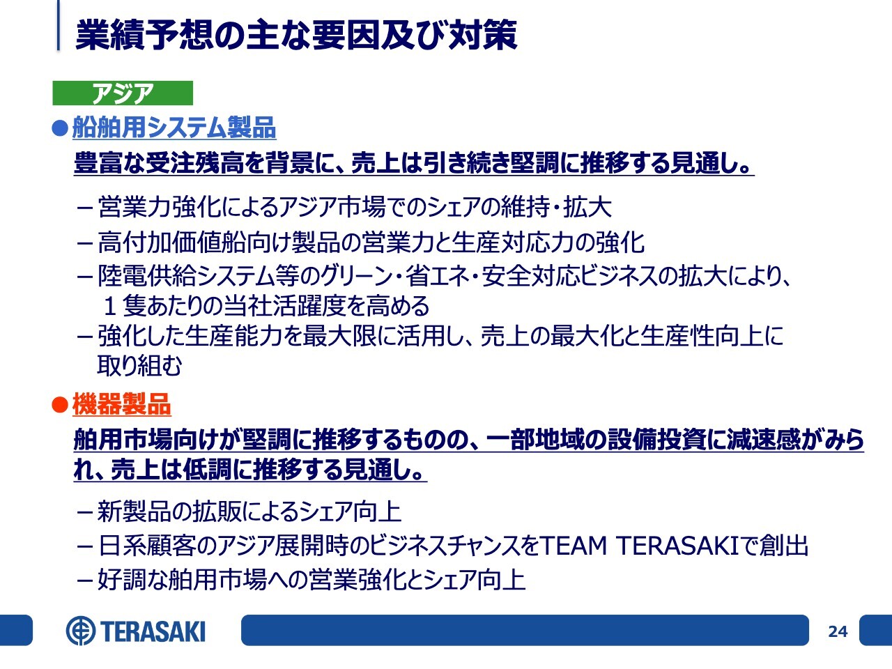 アジアについてです。船舶用システム製品については、豊富な受注残高を背景に売上は引き続き堅調に推移する見通しです。特に中国には2つの工場があり、1つは広州、もう1つは上海近郊の上海工場です。