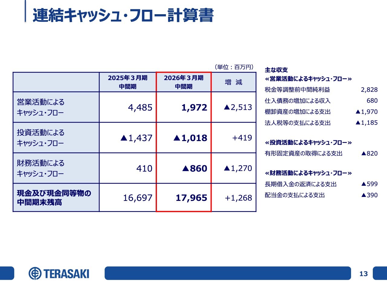 連結キャッシュ・フロー計算書についてです。営業活動によるキャッシュ・フローは19億7,200万円で、前年同期比で約25億円の減少、投資活動によるキャッシュ・フローはマイナス10億1,800万円で、前年同期比4億1,900万円のプラス、財務活動によるキャッシュ・フローはマイナス8億6,000万円で、前年同期比12億7,000万円の減少となっています。