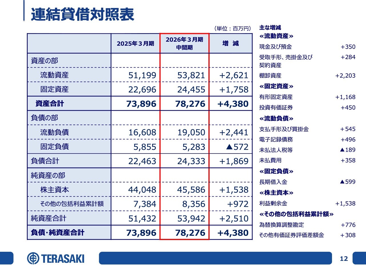 連結貸借対照表、いわゆるバランスシートについてです。ハイライトとして、流動資産では棚卸資産が大幅に増加し、約22億円増えています。これは主に、システム製品の受注増加の影響により仕掛かりが大幅に増えたためです。固定資産では、本社及び子会社であるテラテックの設備投資を行ったことにより、有形固定資産が増加しました。