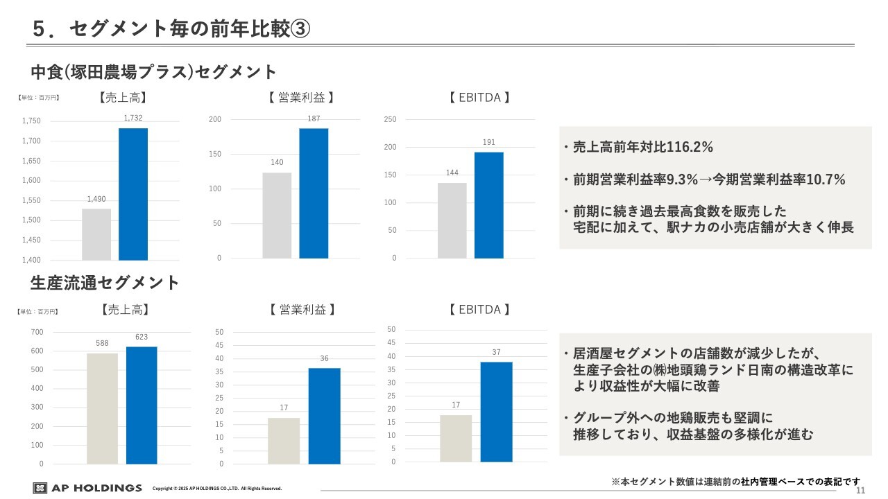 「塚田農場プラス」やお弁当の業態、中食セグメントについては、引き続き順調に推移しています。売上高は前年比116.2パーセント、営業利益率も1.4ポイント改善し、10.7パーセントになりました。