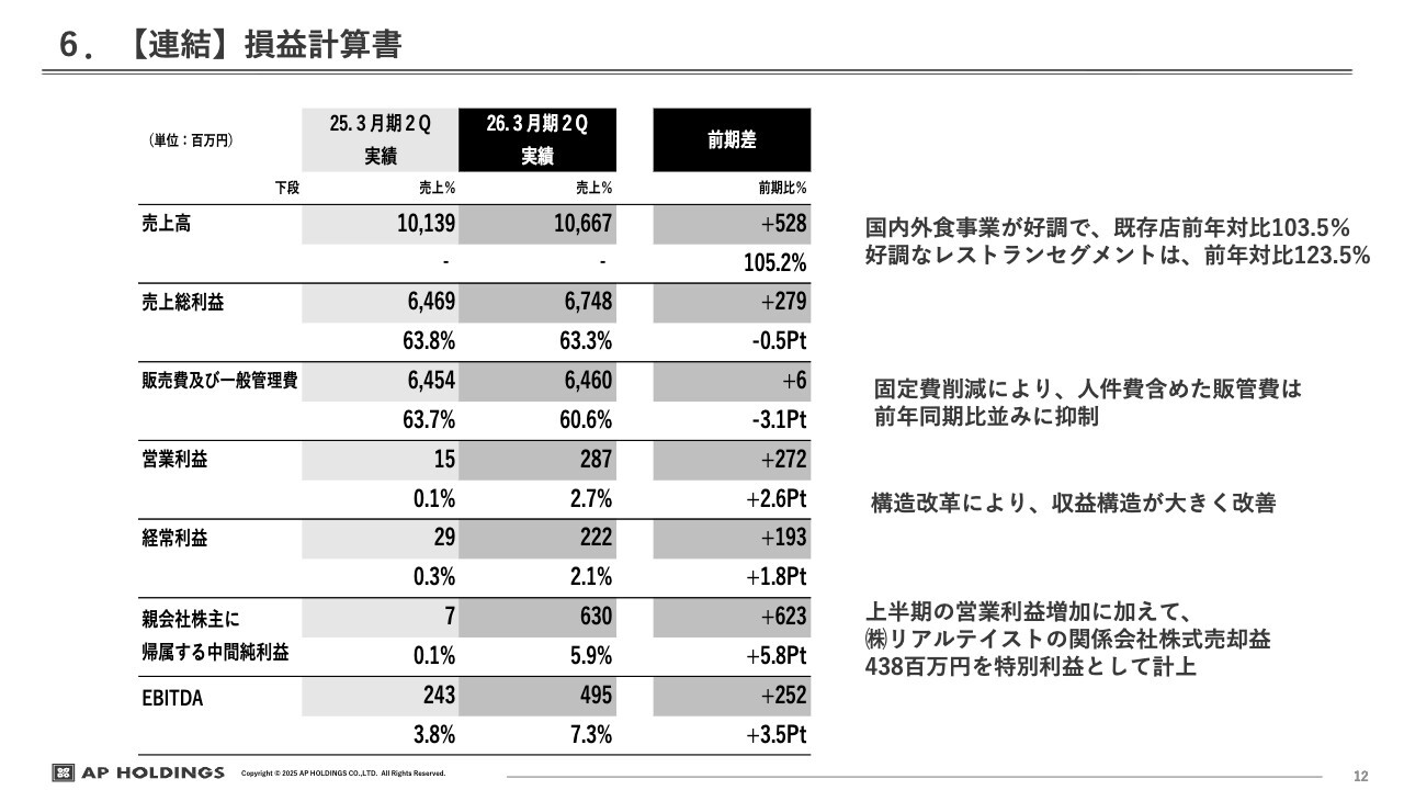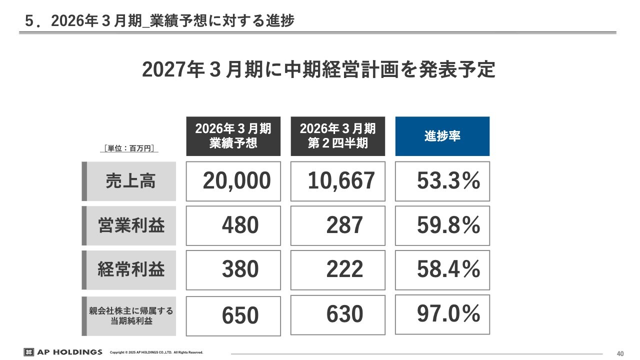 佐藤信之氏:株式会社エー・ピーホールディングス上席執行役員の佐藤です。お忙しい中お集まりいただきまして、ありがとうございます。私から2026年3月期第2四半期の決算について、数字をご報告します。