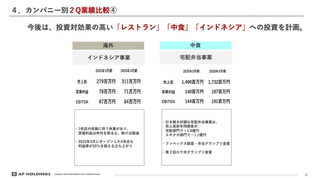 これらを踏まえ、来期以降はレストランや中食、インドネシアあたりを中心に、まずは積極的に投資を進めていく考えです。