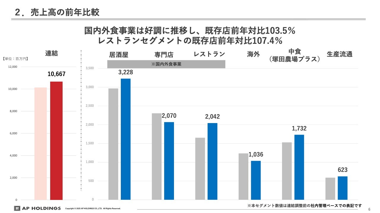 国内外食事業は、居酒屋セグメント、専門店セグメント、レストランセグメントの3つで構成されています。前期と比較すると、全体の既存店売上は103.5パーセントとなっています。特に、レストランセグメントの既存店売上は前年対比107.4パーセントと、好調に推移しました。
