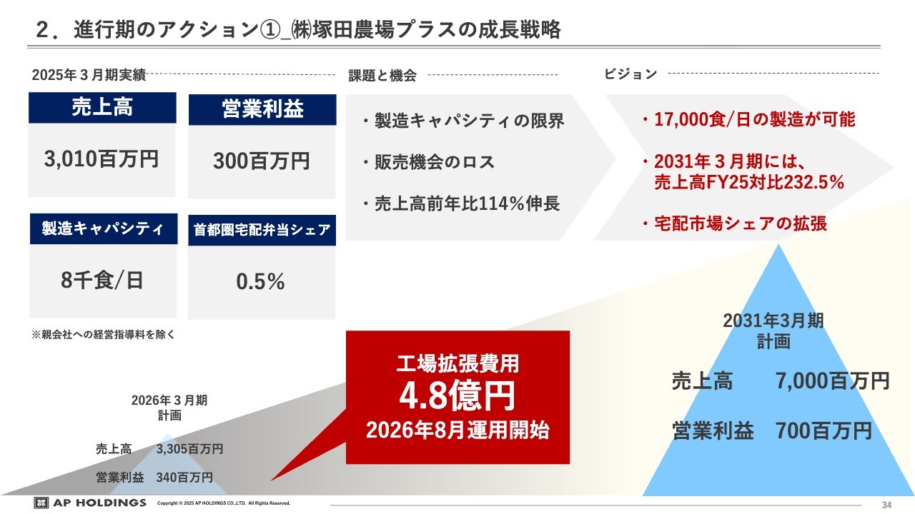 塚田農場プラスは非常に順調に立ち上がっており、2031年3月期に向けて売上高70億円、営業利益7億円を目指し、来期も引き続き投資を進めていきます。