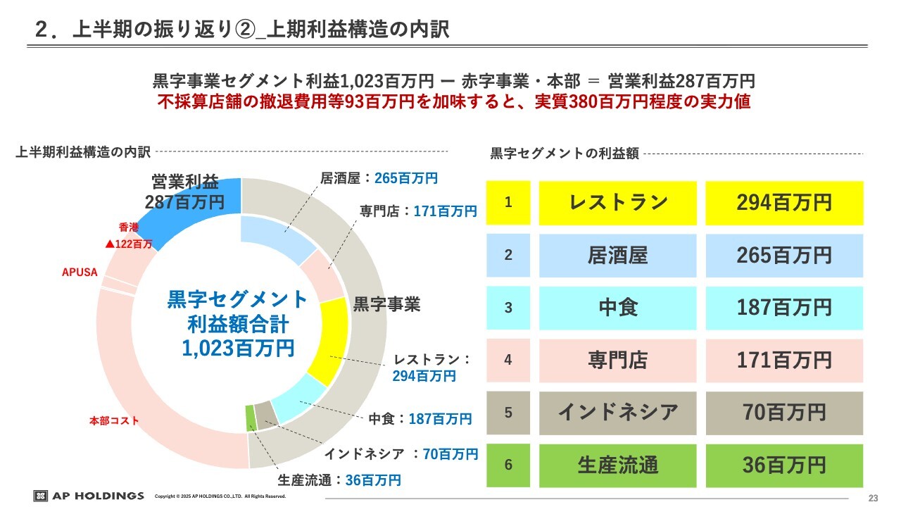 このような事業構造のもと、一部に赤字事業を抱えながらも本部のコストを含め、先ほど佐藤がご説明したとおり、上期の営業利益は2億8,700万円を達成しました。