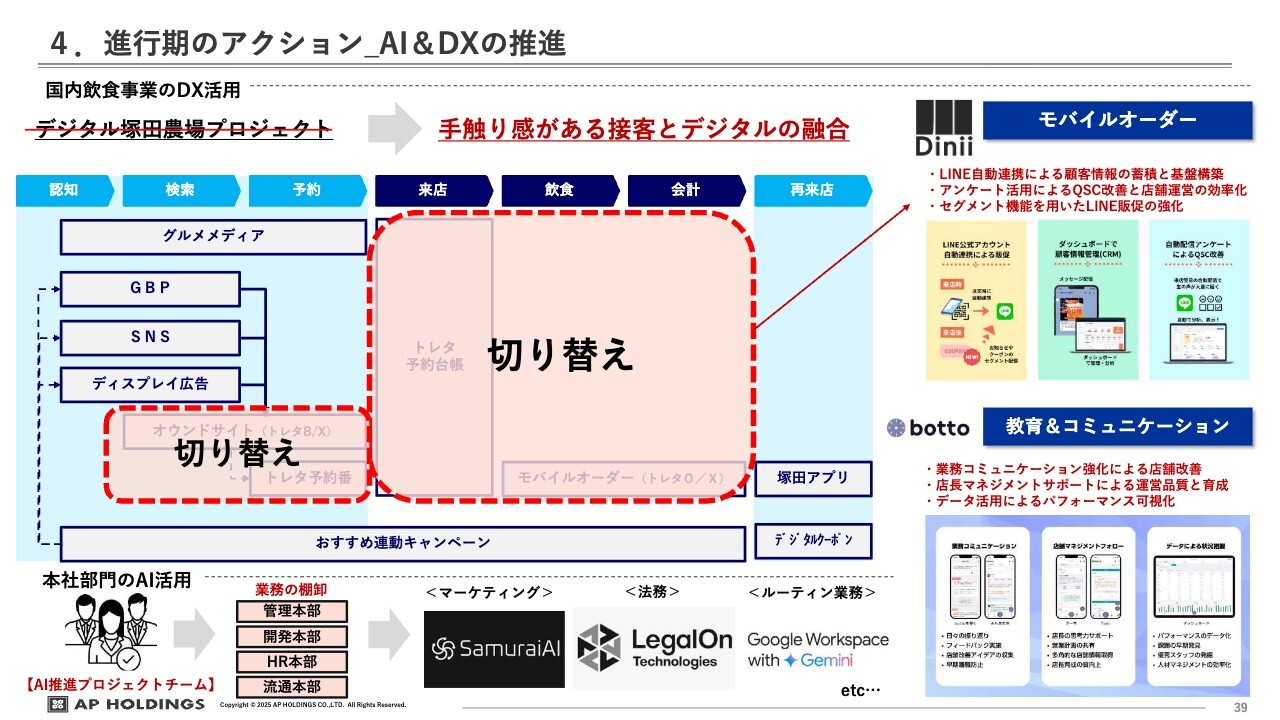 AI&DXの推進ということで、さまざまな取り組みを行っています。例えばモバイルオーダーを全店舗で導入し、その都度効率が良い方法へと臨機応変に切り替えができるよう対応しています。