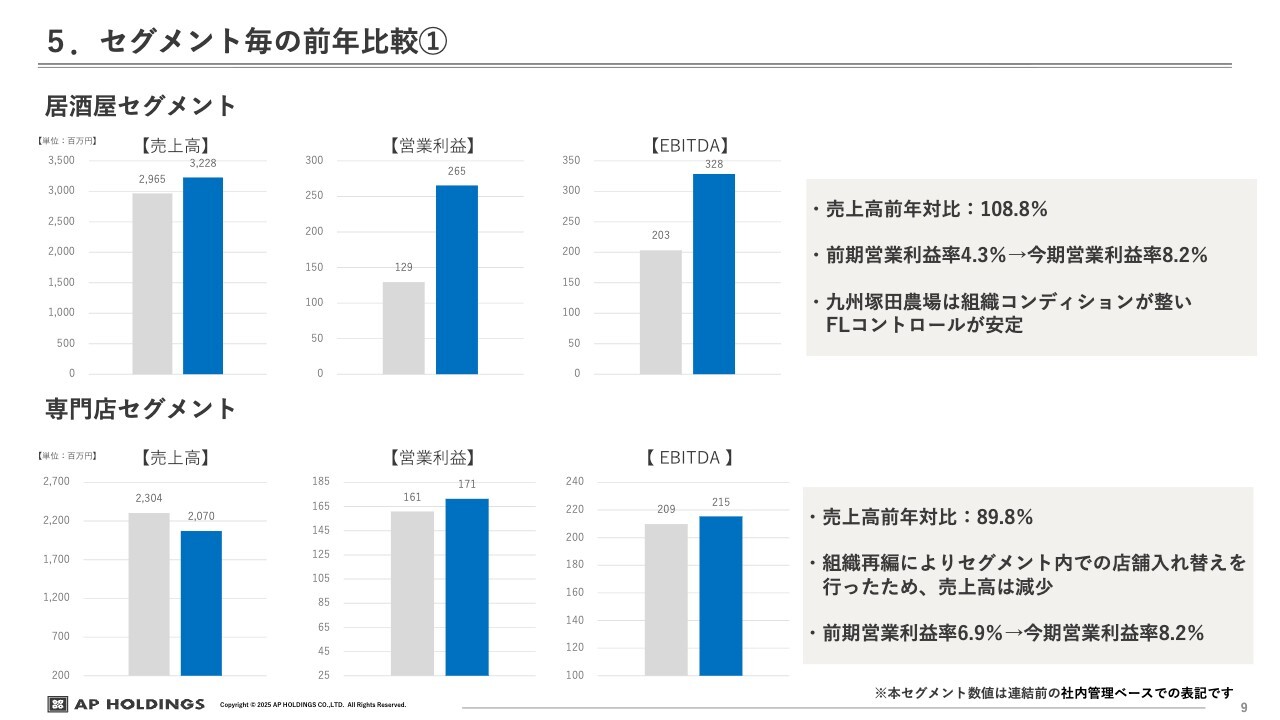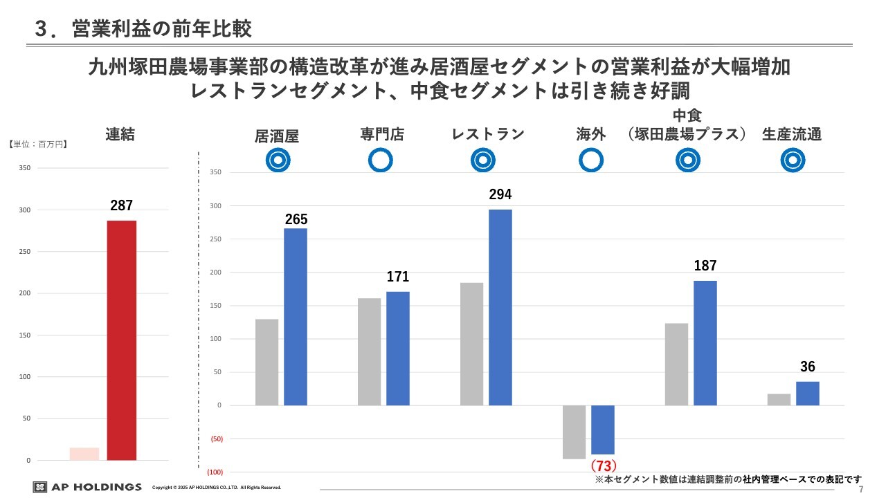 セグメントごとの前年比較です。居酒屋セグメントについては、特に先ほどお話しした「九州塚田農場」では組織の入れ替えなどを行い、組織のコンディションが整ってきたことで、売上高やコストコントロールが効果を発揮し、営業利益が大幅に改善しました。