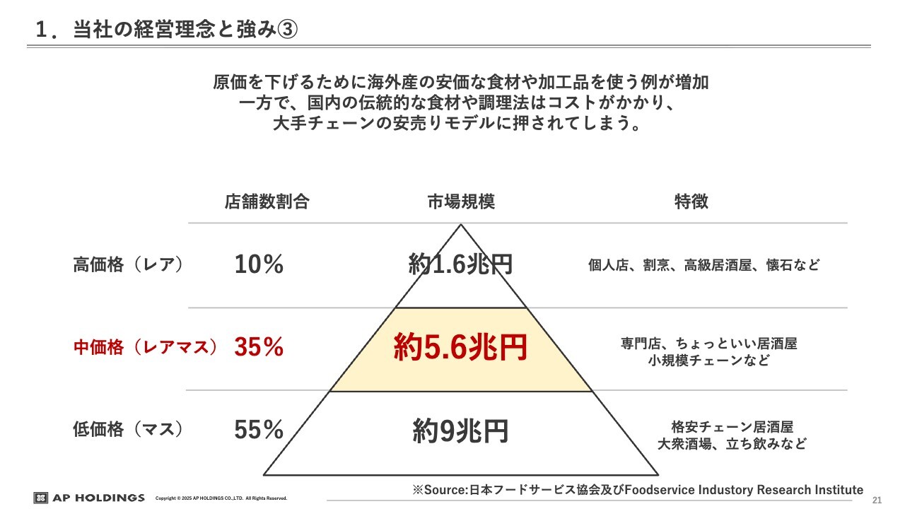 また、人材や料理に関わる社員についても、思考を止めるような仕事の仕方が一般化し、チェーン店では「安い」ということが売りになっています。そのような状況下で、私どもは常に真の価値を追い求めてきました。