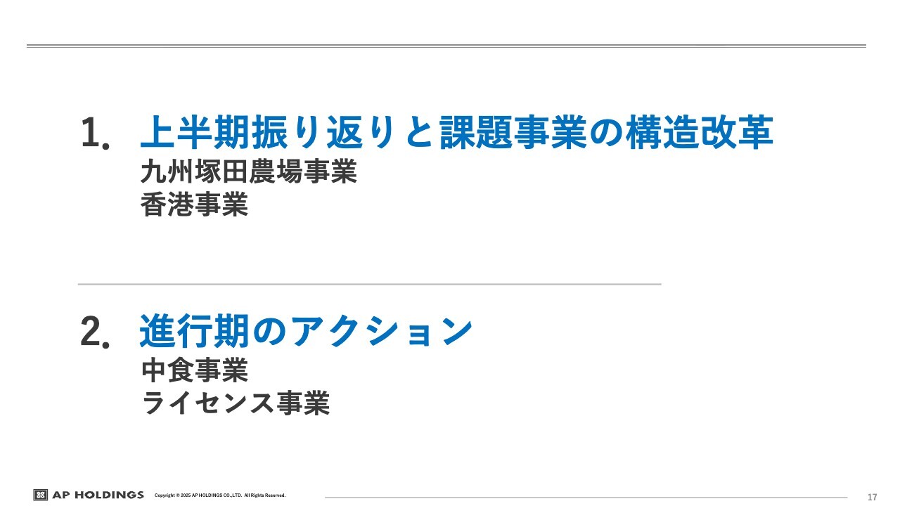 まずは、一度じっくりと経営に取り組もうということで、今期に突入しました。私からは、上半期の振り返りと課題事業についてお話ししたいと思います。特に「九州塚田農場」と香港事業に関しては、ようやく軌道に乗り始め、赤字が止まり、ある程度業界水準の営業利益に戻してきました。