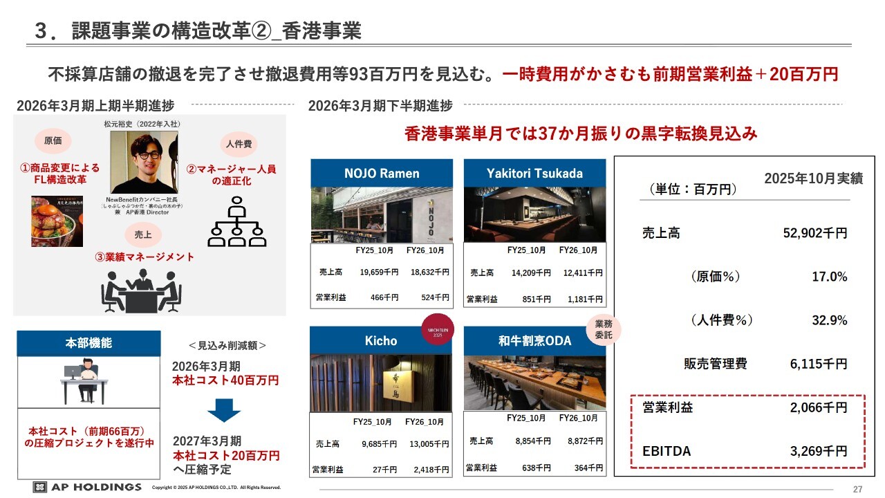 香港事業についてです。香港事業は、37ヶ月ぶりに黒字となりました。特に問題となっていた2店舗が大きな重荷となっており、その撤退が9月に完了しました。