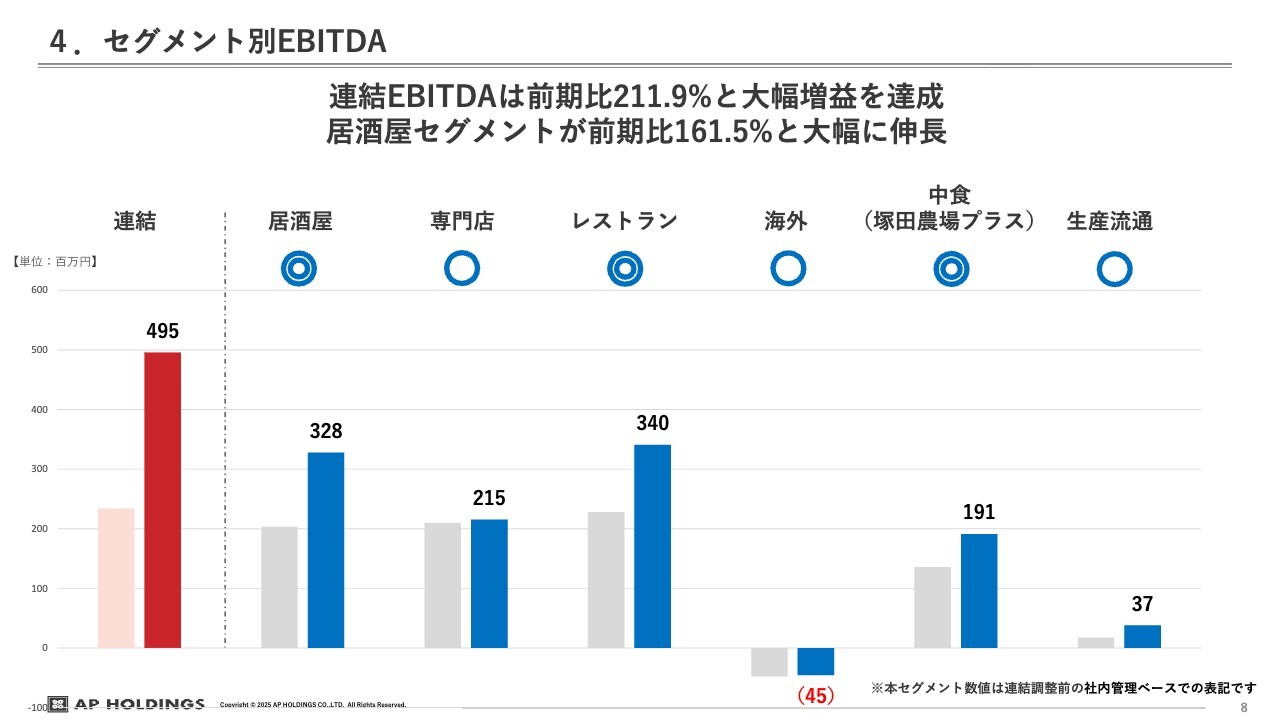 先ほど触れた居酒屋、レストラン、中食、海外についてですが、売上高や営業利益、EBITDA、利益率や額をご覧いただければ、事業やカンパニーによって利益率が売上高に比べて低い場合や高い場合がよくわかるかと思います。