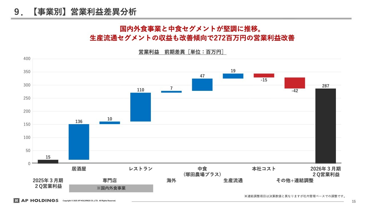 その結果、上から順にレストラン、居酒屋、中食、専門店、海外のインドネシア、生産流通といったかたちで、事業別の収益状況が大きく変化しました。ただし通期で見ると、現時点では居酒屋事業が再び1番になる可能性が高いと考えています。