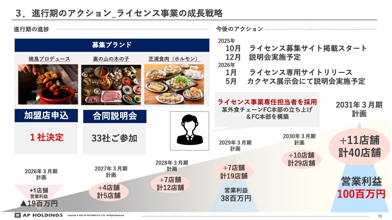 なお、この事業は当社が保有するブランドをパッケージ化して販売する形式のため、投資が不要です。現在は1店舗の契約に基づき、2031年3月期、つまり5年後に40店舗の展開と営業利益1億円を目指す目標を設定しています。