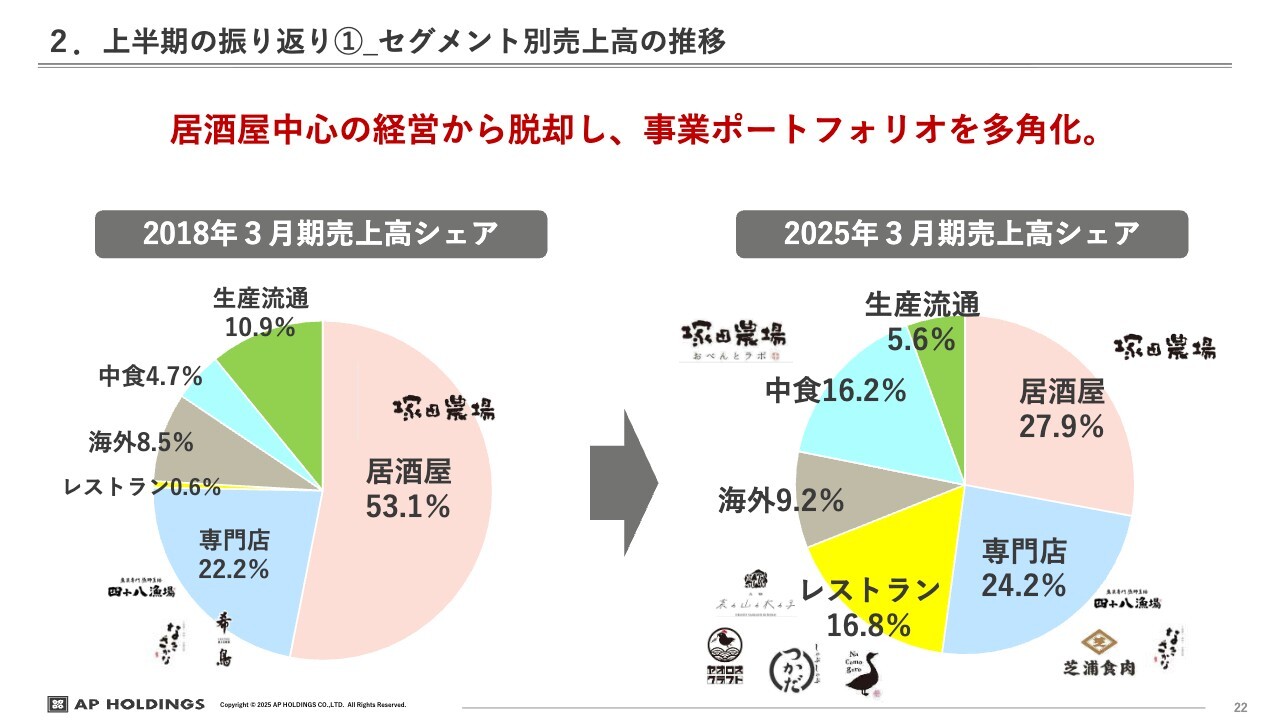 その後は新型コロナウイルスの影響を経て、ようやく理想とするポートフォリオバランスが実現しつつあると考えています。現在は居酒屋、専門店、レストラン、海外、中食が主な収益の柱となっています。