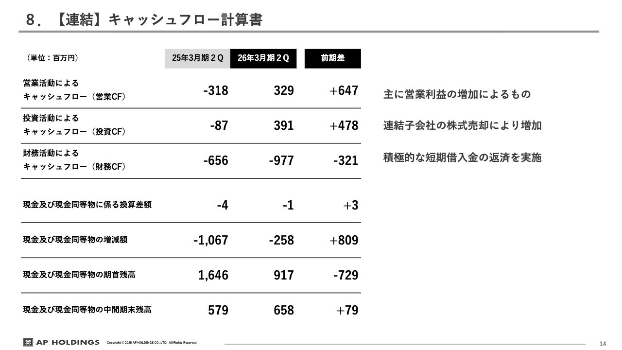 さらに、財務活動によるキャッシュフローは、借入金の返済が進んだことによるキャッシュアウトが9億7,700万円発生し、前期と比較して3億円ほど支出が増加しています。