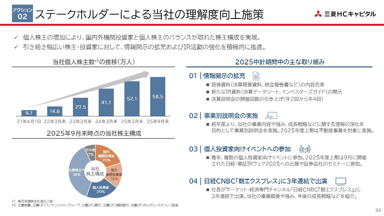 スライド右側に示した具体的な取り組みをご説明する前に、左側にある当社の株主構成について簡単に触れます。左上の棒グラフは、2021年4月の経営統合以降における個人株主数の推移を示しており、ご覧のとおり、この4年半で6倍以上となる58万人に達しています。