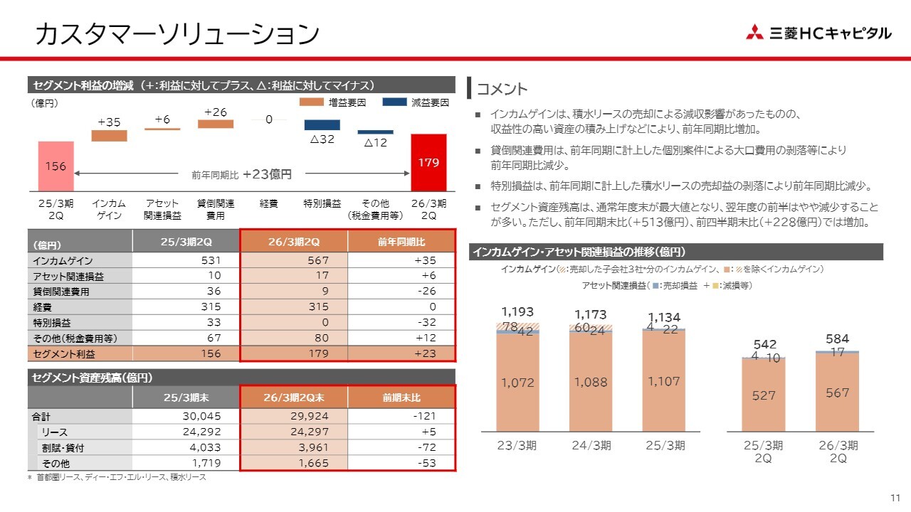 カスタマーソリューションでは、先ほど申し上げたように新規案件も含めたアセットの積み上げが着実に進んでいます。参考までに申し上げると、前期第1四半期に子会社の売却を実行したことでインカムゲインが減少したところからスタートしました。そのため、セグメント利益ベースでは昨年より23億円下がった水準からのスタートとなっています。