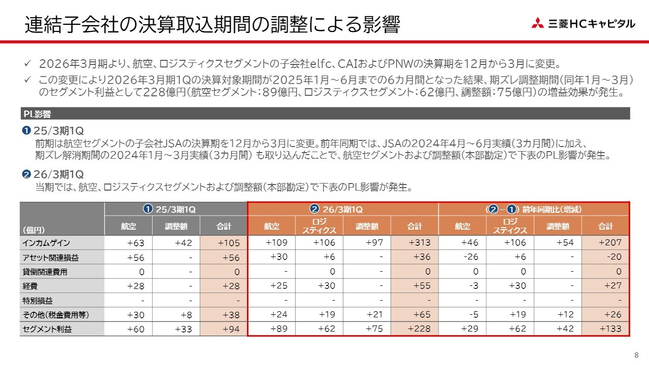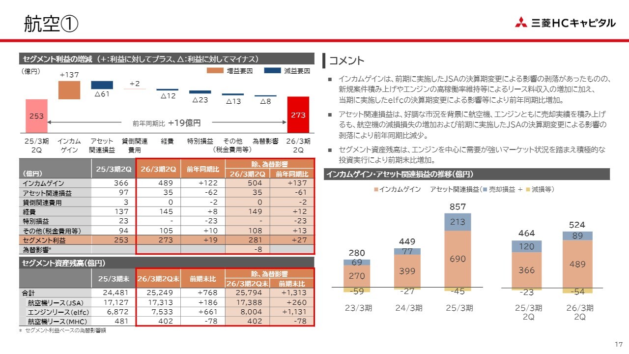 航空セグメントについてです。減損損失の増加はありましたが、新規案件の積み上げによるリース収入の増加、航空機エンジンリースにおける高稼働率の維持、さらに子会社の決算期変更の影響により、セグメント利益は前年同期比で19億円の増益となりました。