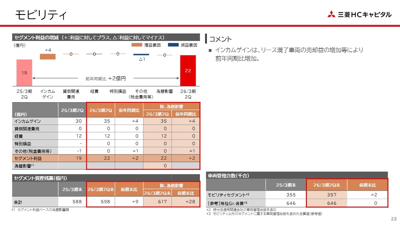 モビリティセグメントについてです。オートリース事業におけるリース満了車両の売却益が増加したことなどにより、セグメント利益は前年同期比で2億円の増益となりました。数字としては小さいですが、着実に進捗しています。