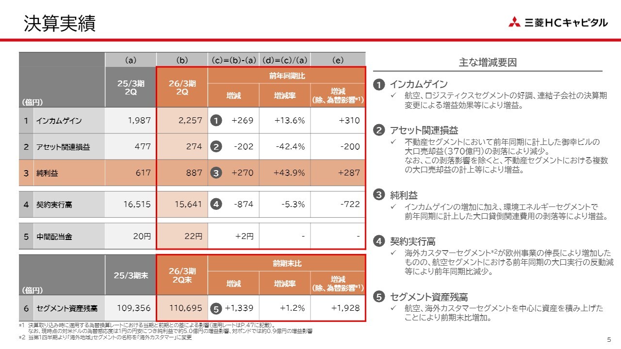 まずは、2026年3月期第2四半期の決算実績についてご説明します。①のインカムゲインについては、連結子会社の決算期変更による増益効果がありましたが、それを除いても、第1四半期に続き、航空セグメントとロジスティクスセグメントの2つが好調を維持しており、インカムゲイン増加を牽引しています。