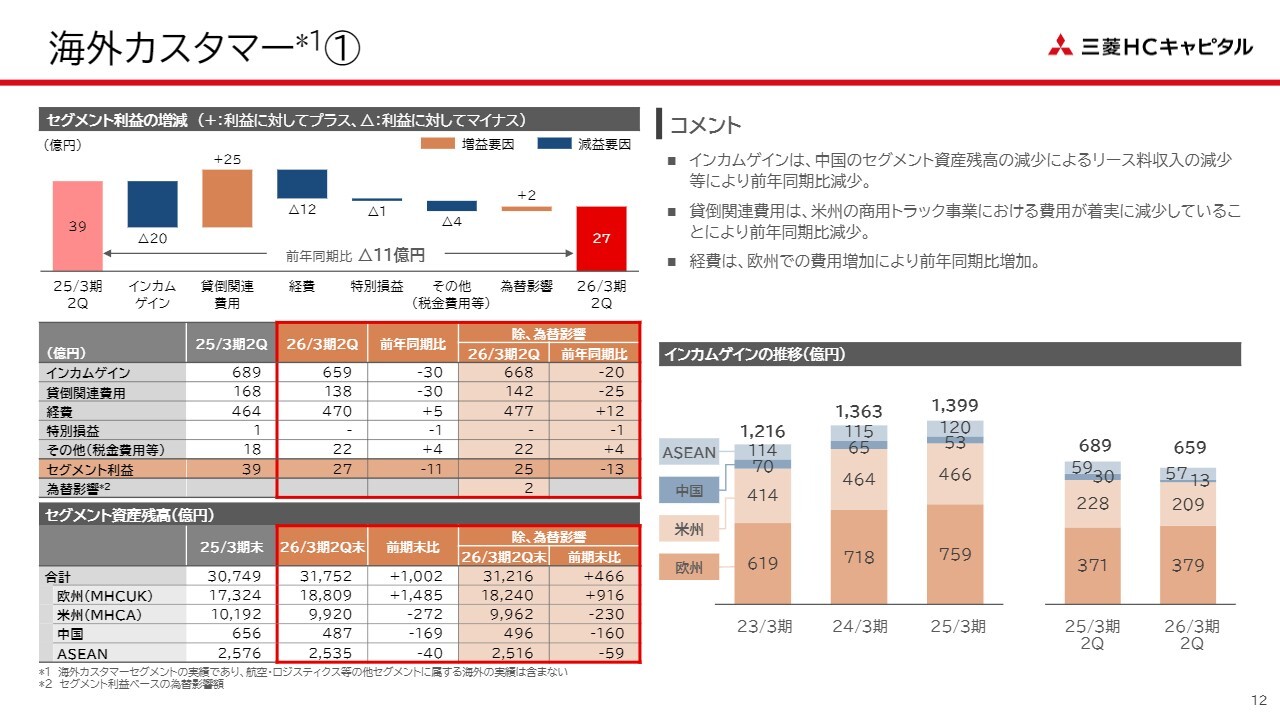 海外カスタマー全体の収益性についてですが、今回の中期経営計画期間を通じても、バランスシートをこれ以上大きくすることは想定していません。その中で純利益や収益性を高めることが、現在の中期経営計画のテーマである「ビジネスモデルの進化と積層化」に該当します。