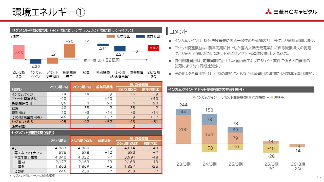 環境エネルギーセグメントについて、前年同期に計上した大口の貸倒関連費用や減損損失などの剥落により、セグメント利益は52億円改善しました。しかし一方で、海外の持分法投資先で一過性の評価損を計上したことや、出資先であるEuropean Energyにおけるのれんの償却を含む持分投資に関わる損失の計上などが影響し、第1四半期に続いて引き続き損失が計上されている状況です。
