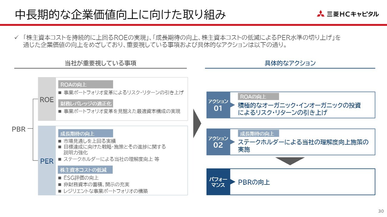 スライドの左側の図は、これまで何度かご説明してきたとおり、企業価値を測る指標の1つであるPBRの向上を起点に、その構成要素であるROEとPERの観点から、当社が重要視している点を整理したものです。