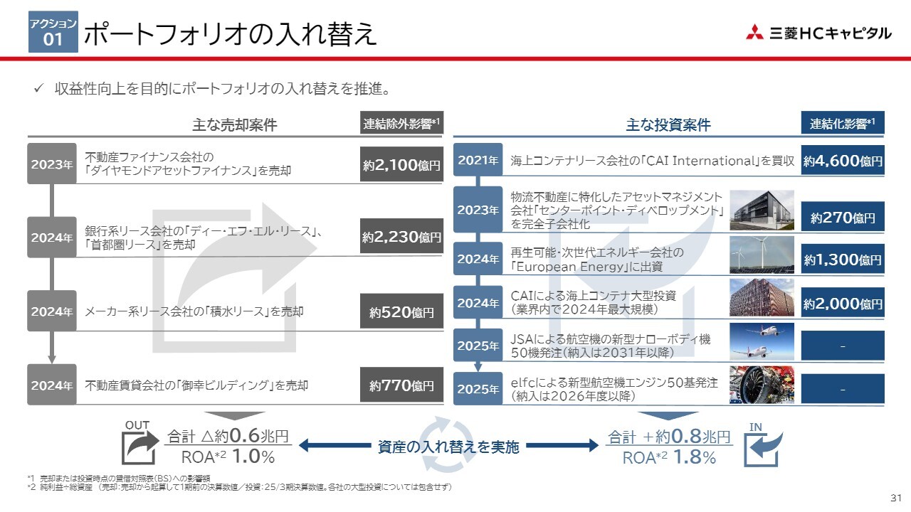 まず1つ目のアクションとして、ROA向上に向けた施策についてです。収益性を高めるために、新規投資や資産の入れ替えを行い、事業ごとの戦略やリスク特性を踏まえたリスクリターンの最適化を含むポートフォリオマネジメントを進めてきました。