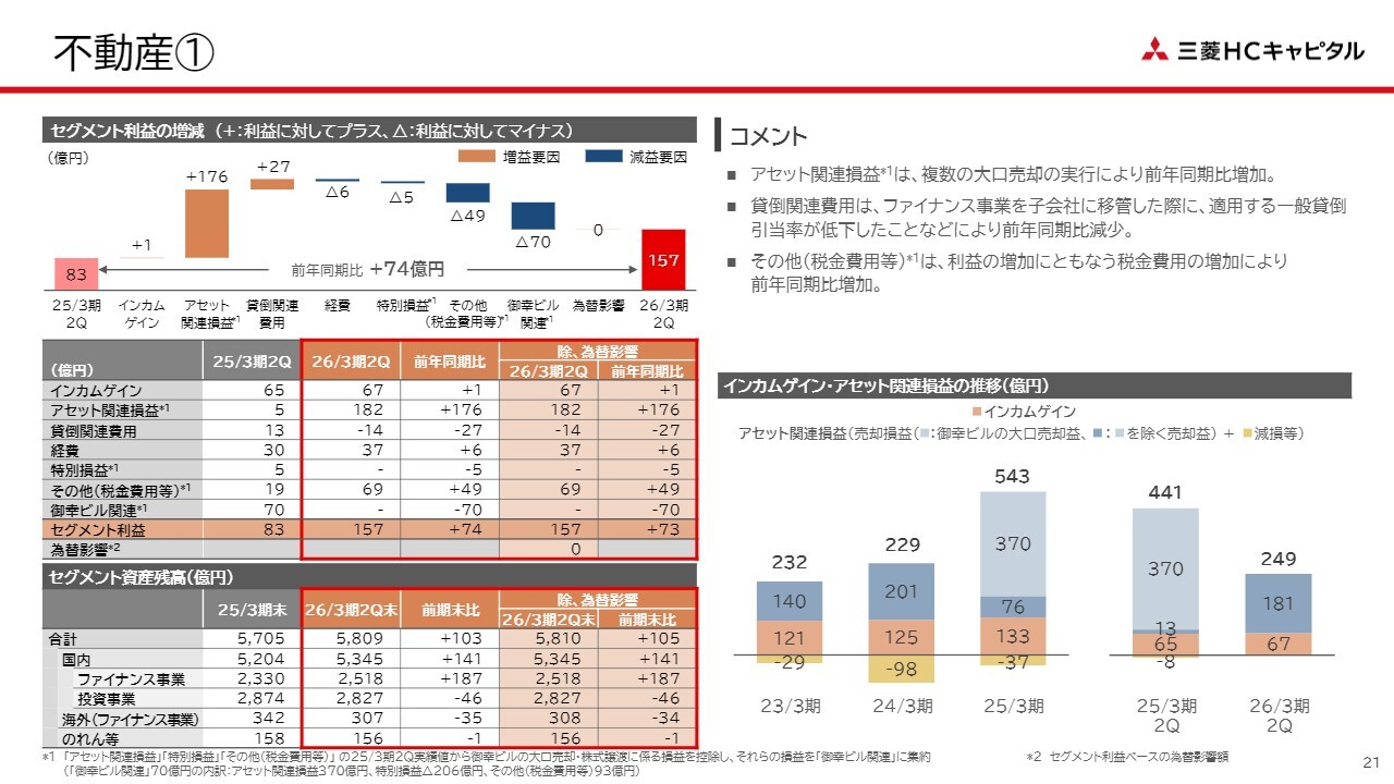 続きまして、②のアセット関連損益についてご説明します。前年同期には株式会社御幸ビルディングの大口売却益がありましたが、その剥落により、前年同期比で減益となっています。ただし、この一過性要因を除いた実質ベースでは、不動産セグメントにおいて複数の大口売却益を計上したことなどから、前年同期比で増益となっています。