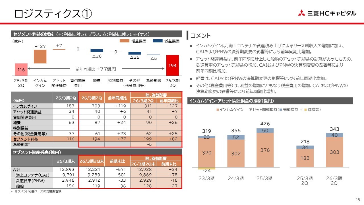 ロジスティクスセグメントについてです。こちらは、決算期変更の影響による増益効果に加え、海上コンテナ資産の積み上げによるリース料収入の増加、さらに鉄道貨車のアセット売却益の増加などにより、セグメント利益は前年同期比77億円の増益となりました。