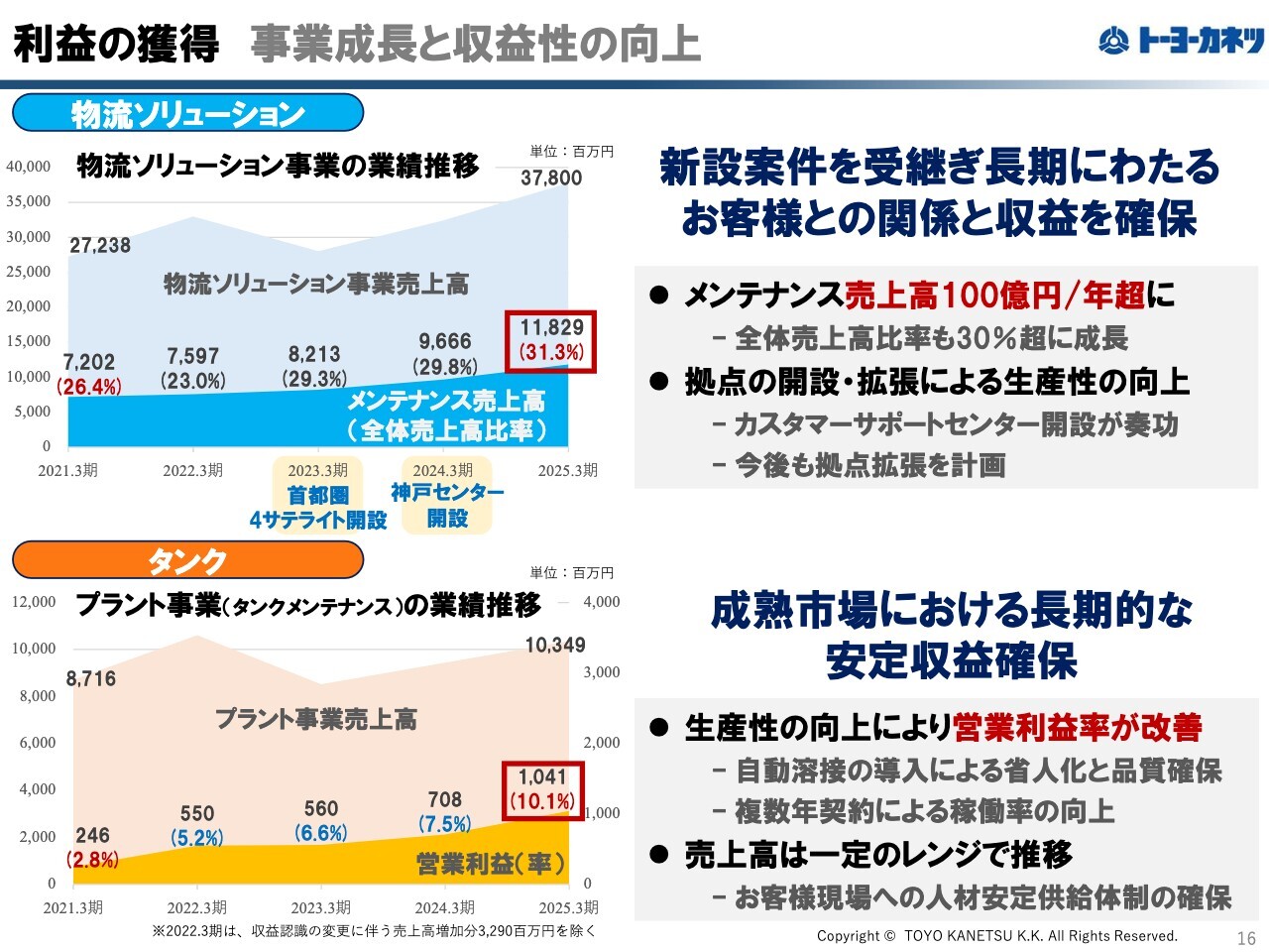 一方で、プラント事業では、現場人材の確保、複数年契約の獲得、自動技術の導入などにより、この数年間で営業利益率を10パーセント前後まで大きく改善することに成功しました。