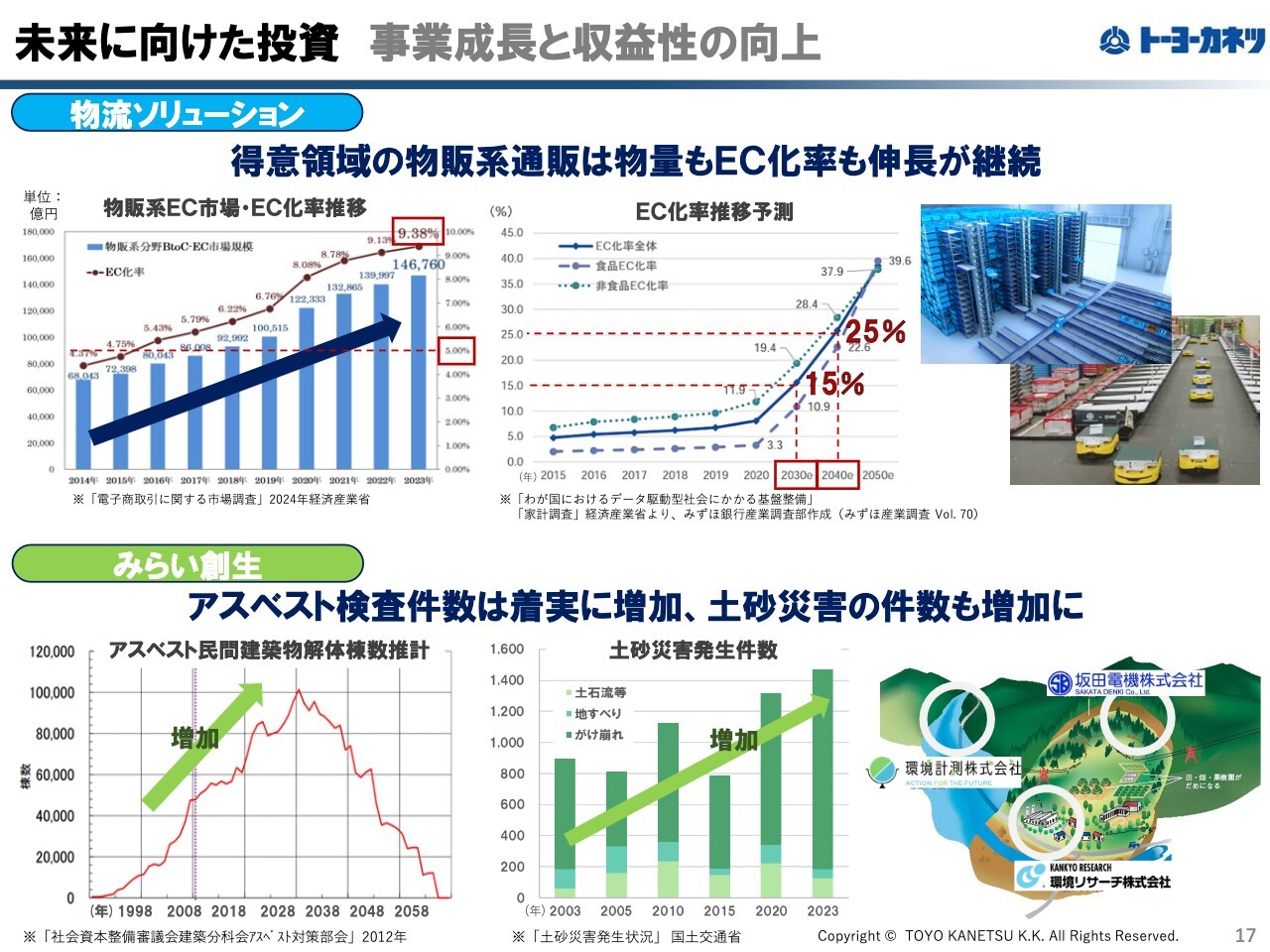 こうして獲得した利益は、得意とする領域と新たにチャレンジする領域に活用します。このページには市場環境に関するデータの一部が記載されていますが、物流ソリューション事業では特に得意としているEC市場の規模拡大およびEC化率の伸長の継続が予想されています。