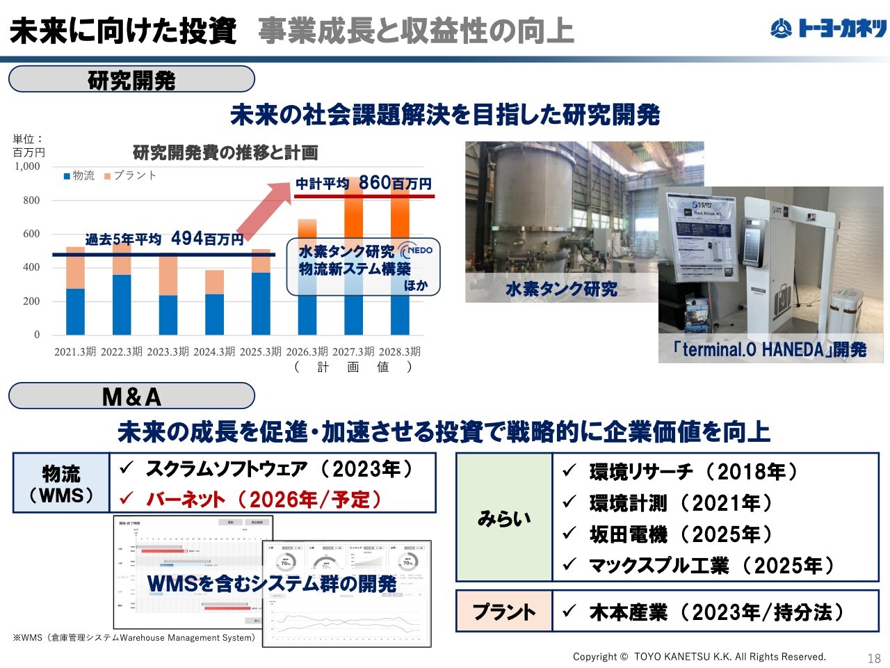 M&Aについては、物流ソリューション事業とみらい創生事業の環境・防災領域で引き続き活動を進めています。物流ソリューション事業では、WMS(倉庫管理システム)をはじめとしたソフトウェア強化を目的に、ソフトウェアエンジニアを抱えるバーネット社のグループインを発表しました。