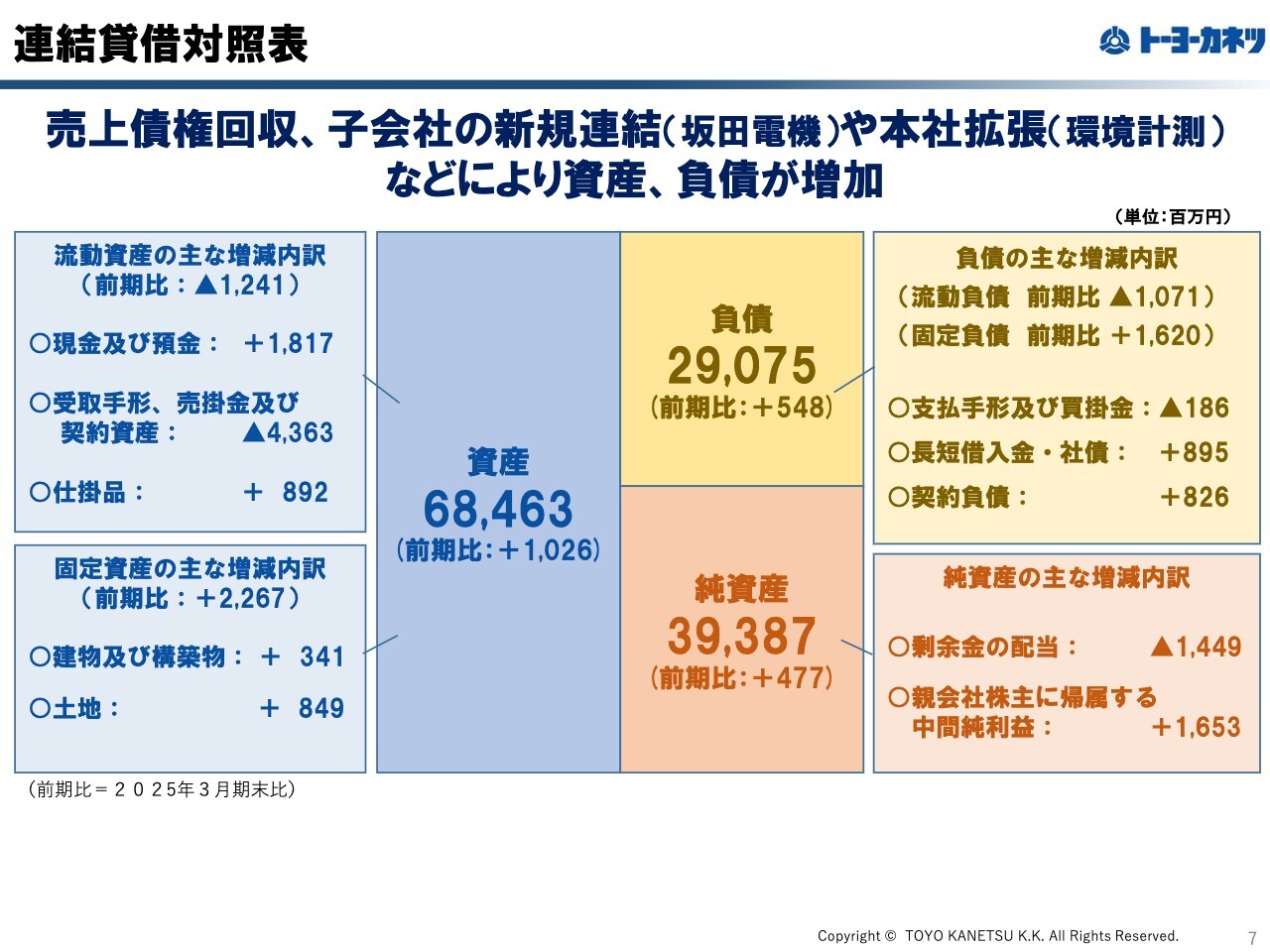 連結貸借対照表です。売上債権の回収により現金及び預金が増加し、製造工程の前倒しにより仕掛品が増えました。また、坂田電機の連結や環境計測の本社拡張などにより、有形固定資産や有利子負債が増加しています。その他の主な増減の内訳については、スライドに記載のとおりです。