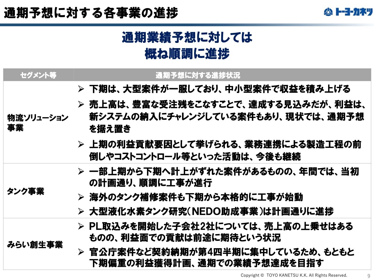 プラント事業は順調に進んでおり、海外のタンク補修案件も9月から本格的に始動しました。また、大型液化水素タンクの研究も計画どおり順調に進捗しています。