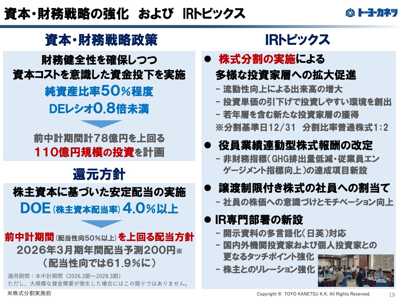 スライド右側のIRトピックスに関する内容です。当社は、多様な投資家がよりアプローチしやすく、株主になっていただけるように、12月31日を基準日、翌1月1日を効力発効日として、普通株式1対2の株式分割を実施します。これにより、出来高の増大や単価の引き下げを通じた市場取引の活性化および若年層を含めた株主層の拡大を促進します。