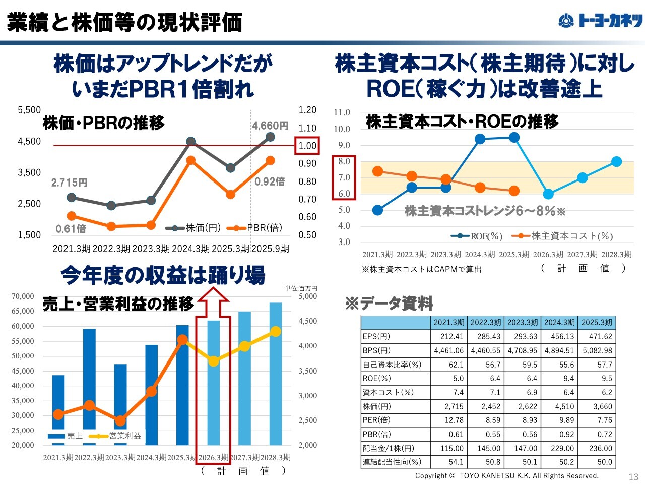 資本コストと株価を意識した経営の現状認識についてです。スライド左上にある株価とPBRの推移グラフをご覧ください。2021年3月期の株価は2,715円でした。それから株価は約1.7倍に向上しましたが、PBRは依然として1倍を下回る状況です。