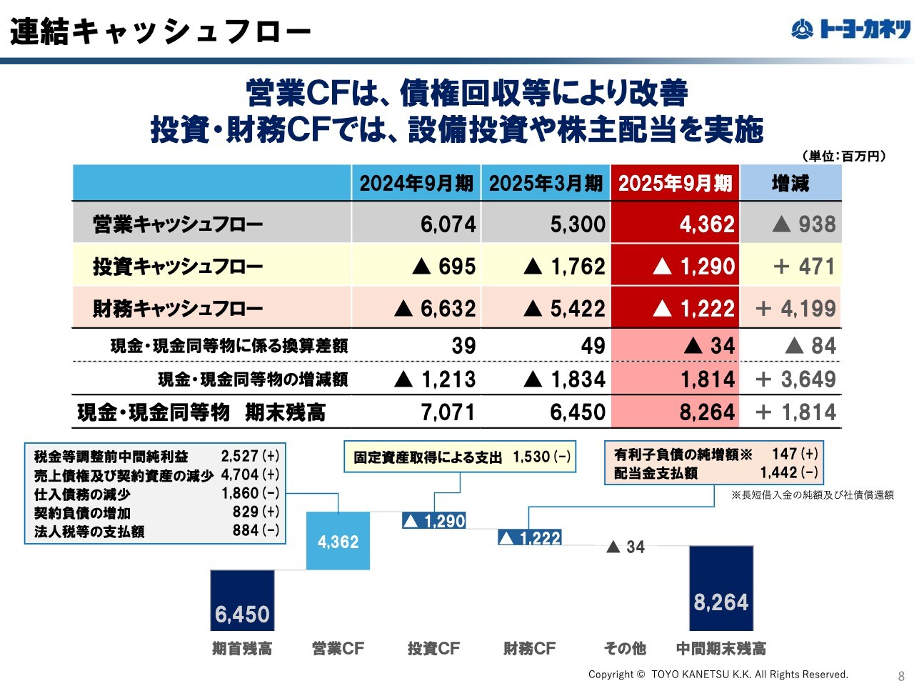 連結キャッシュ・フローの状況です。売上債権の回収や仕入債務の減少、契約負債などにより営業キャッシュ・フローが改善し、それらを投資および財務キャッシュ・フローに充てました。