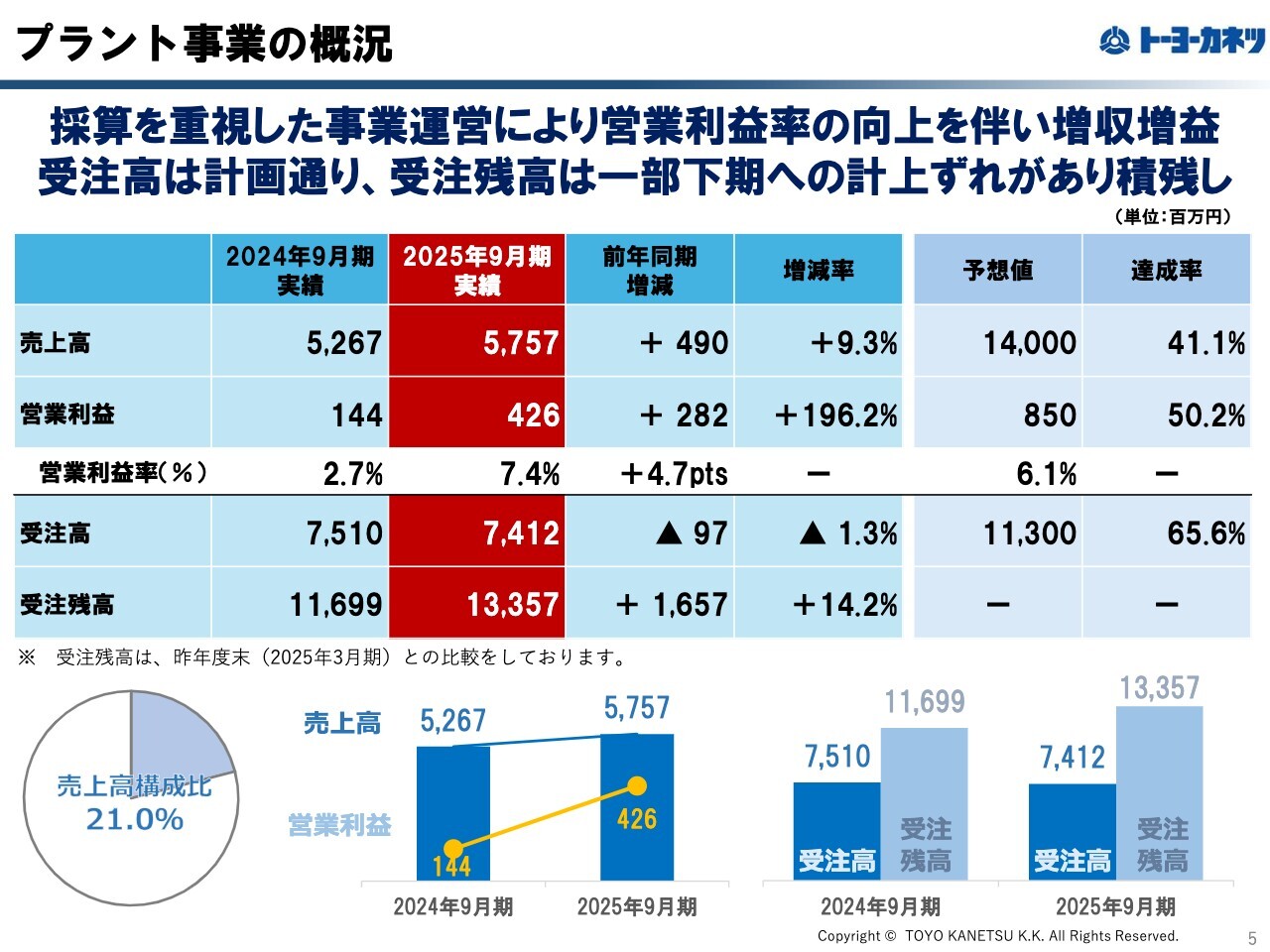 プラント事業の概況です。売上高は57億5,700万円、営業利益は4億2,600万円となり、増収増益となりました。採算を重視した事業運営を進める中で、現場を1つ減らしましたが、その他の現場がカバーすることで営業利益率を向上させ、上半期を折り返しています。