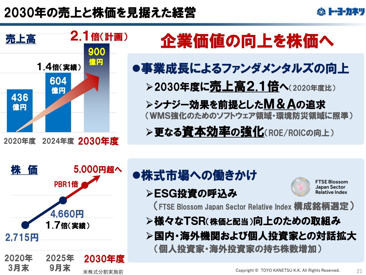 スライドの左下のグラフにあるように、2020年からの株価上昇率の実績をもとに、2030年度にはPBR1倍と、さらなる株価上昇を見据えています。これを実現するために、売上高の増大、資本効率の向上、事業成長策の推進など、さまざまな手段を駆使して企業価値の向上を目指していきます。