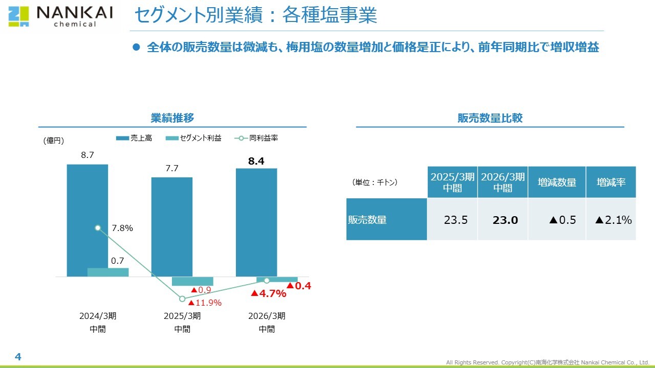 各種塩事業についてです。販売数量はほぼ前年度並みですが、単価の高い梅用塩の数量が増加したことや、価格の一部是正により増収増益となりました。