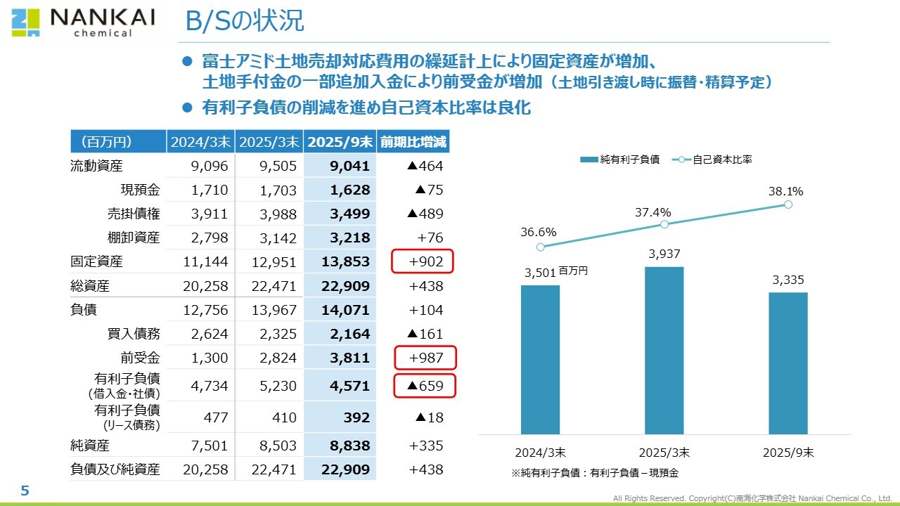 B/Sの状況です。固定資産が増加している原因としては、すでに公表している子会社の土地売却対応の一環として、整地や土壌改良などの費用を繰り延べていることが挙げられます。一方、負債においては前受金が増加していますが、これも土地売却にかかる手付金の一部追加入金によるものです。