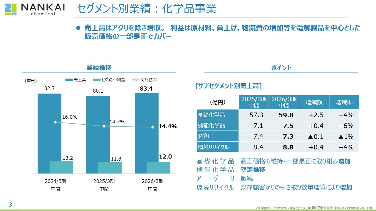 2025年11月27日に発表された、南海化学株式会社2026年3月期第2四半期決算説明の内容を書き起こしでお伝えします。
