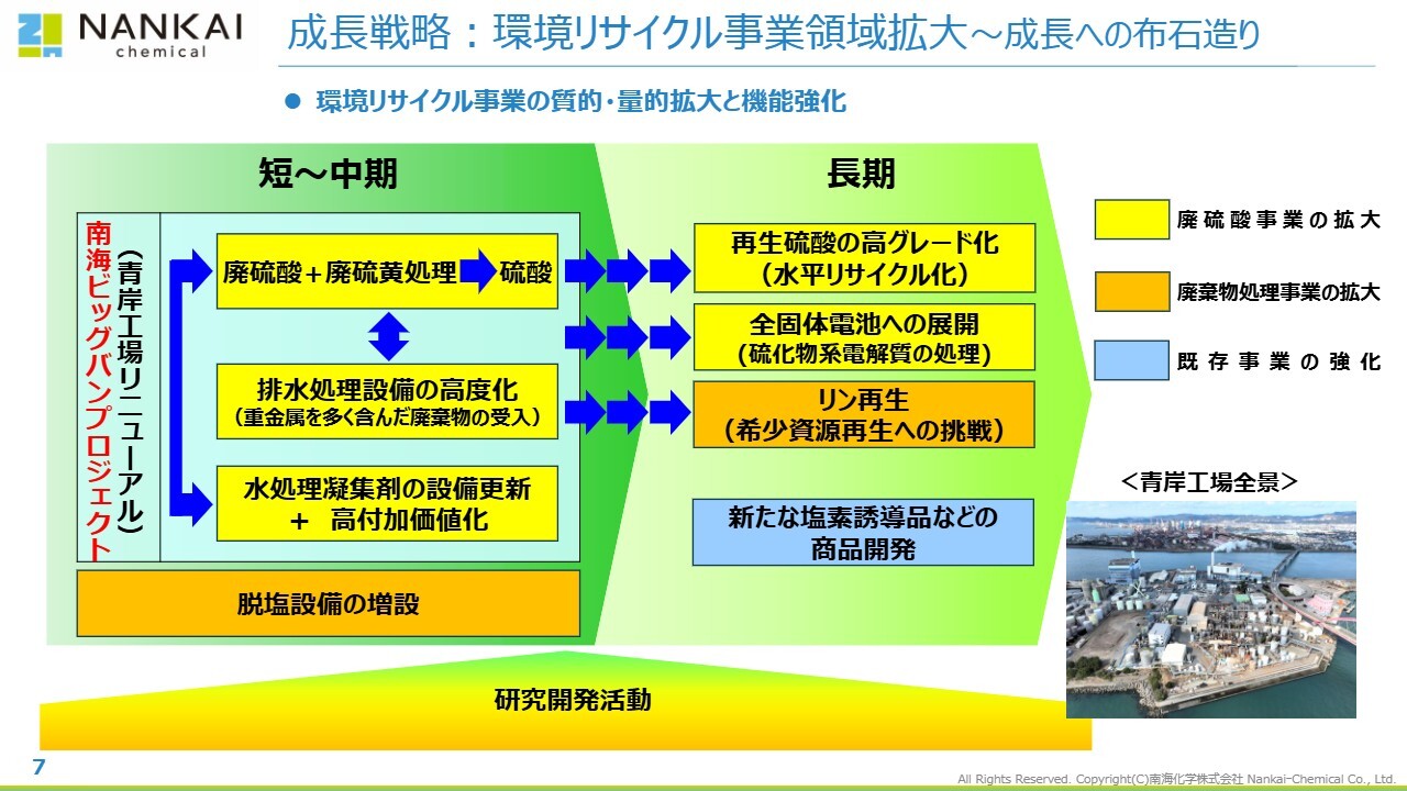 これにより、リサイクル硫酸の受け皿の安定化を図るとともに、生産効率の向上や高付加価値化によって収益性を高めることを目指します。一方、「南海ビッグバンプロジェクト」の1番目に位置する廃硫黄のリサイクルについては、その技術の検証および環境アセスメントが必要となる可能性があるため、今しばらく時間が必要です。
