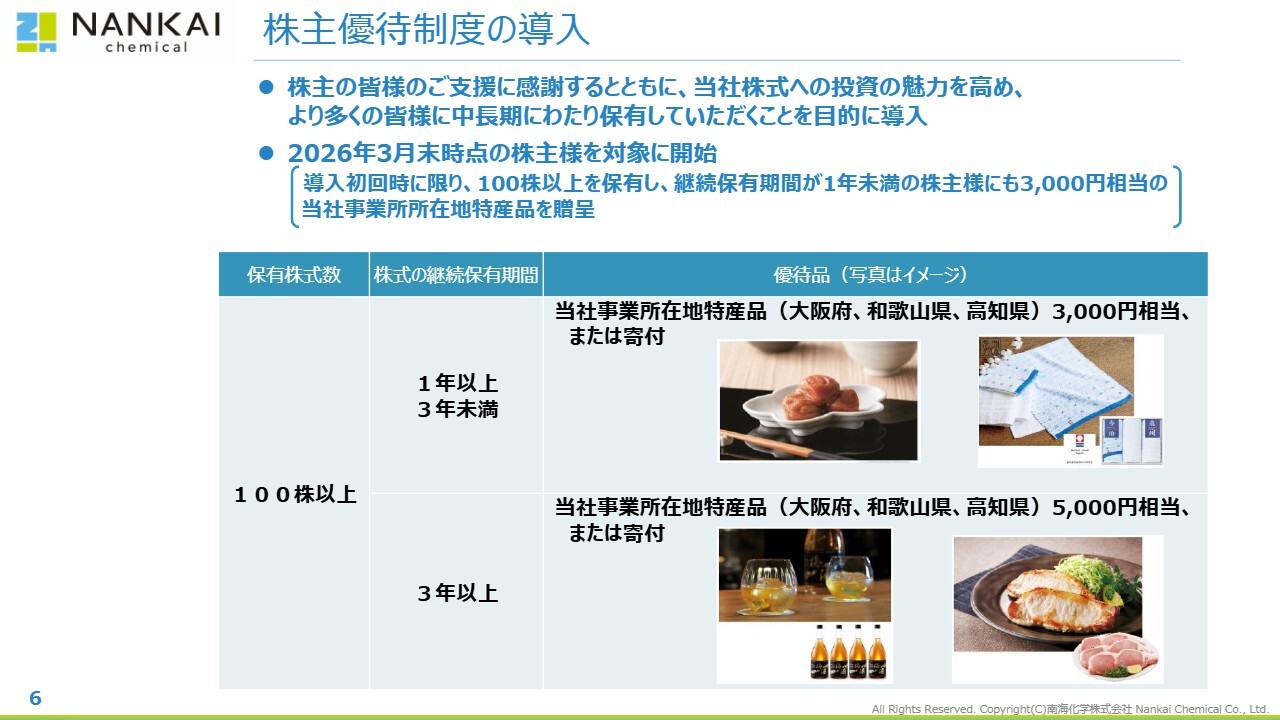 なお、初回は2026年3月末時点での保有株式数および継続保有期間に応じて実施します。継続保有期間については、2023年3月末までさかのぼって算出します。導入初回に限り、2026年3月末時点で100株以上を保有し、継続保有期間が1年未満の株主さまにも、3,000円相当の当社事業所所在地特産品を贈呈します。