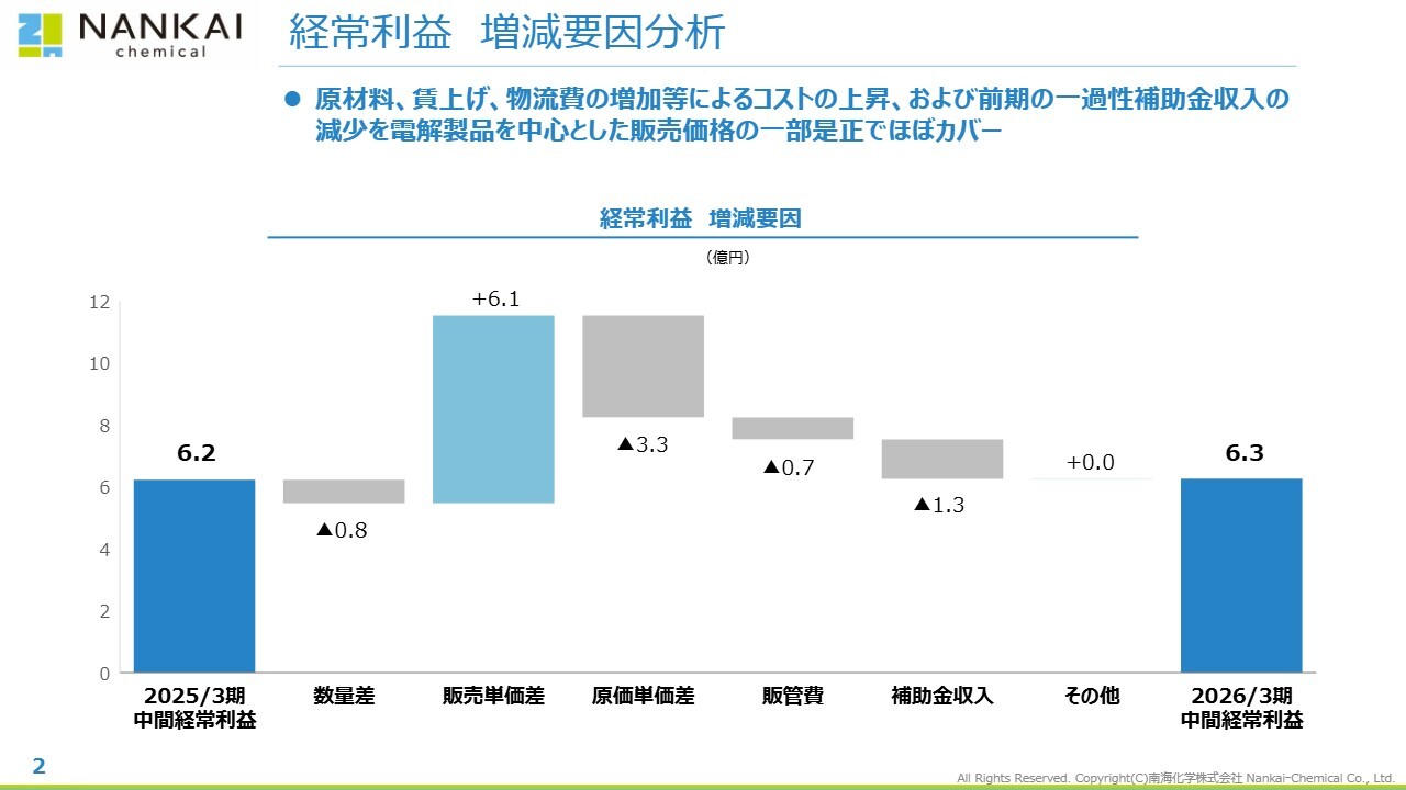 連結ベースでの経常利益の増減分析についてご説明します。前期比で火災事故の影響による高度晒粉の輸出減、農薬需要減による販売数量の減少、原価上昇、賃上げ、物流費のマイナス影響に加え、一過性補助金収入の減少がありましたが、製品の販売価格の是正によってこれをカバーし、経常利益は前年同期並みを確保しました。